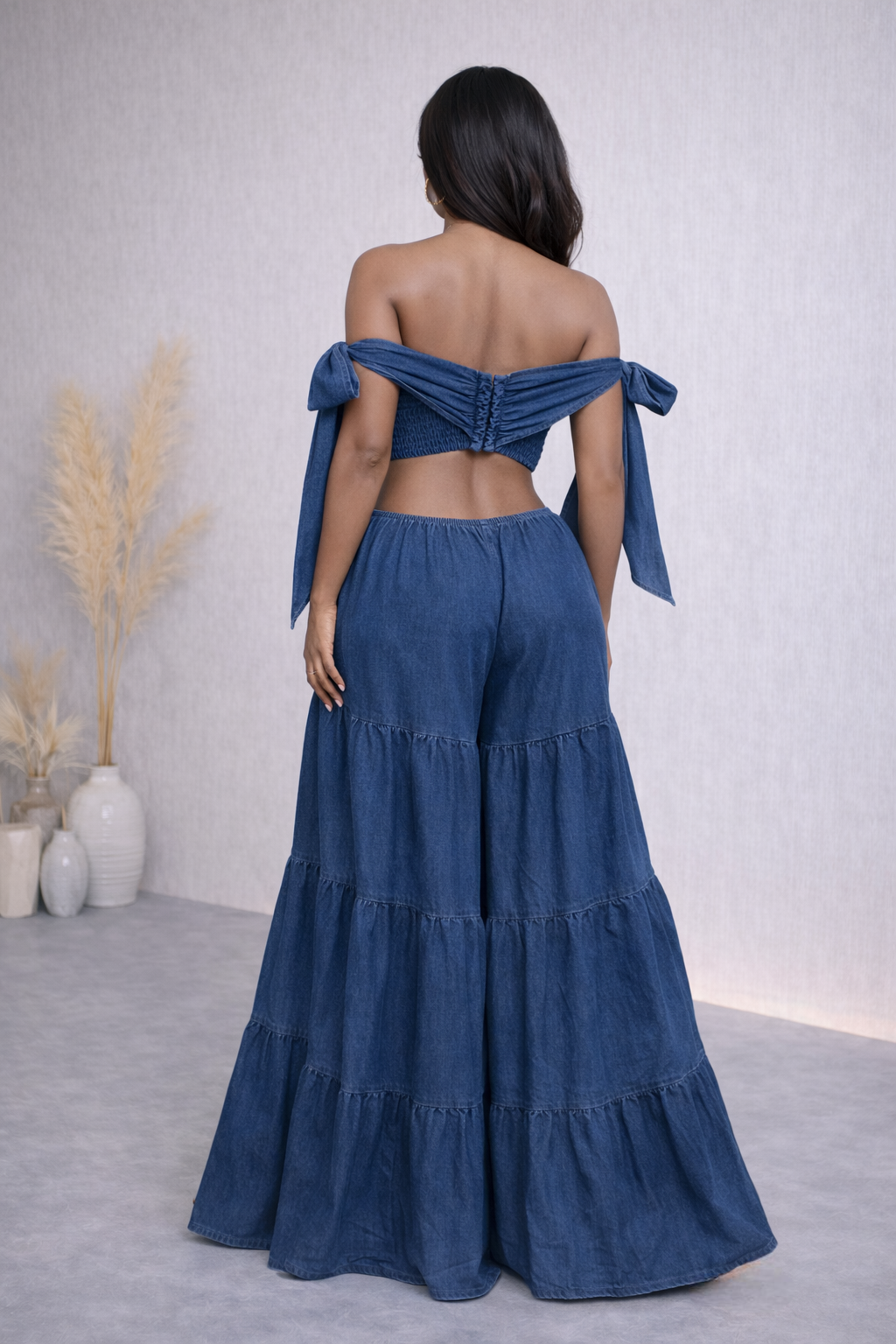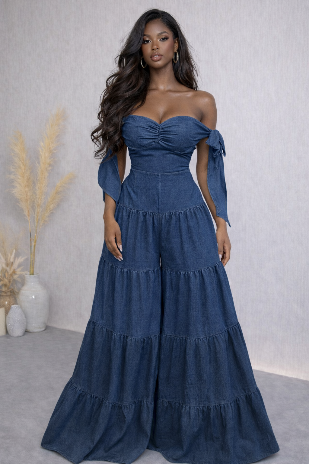 JR5138P - DENIM OFF SHOULDER WIDE LEG JUMPSUIT